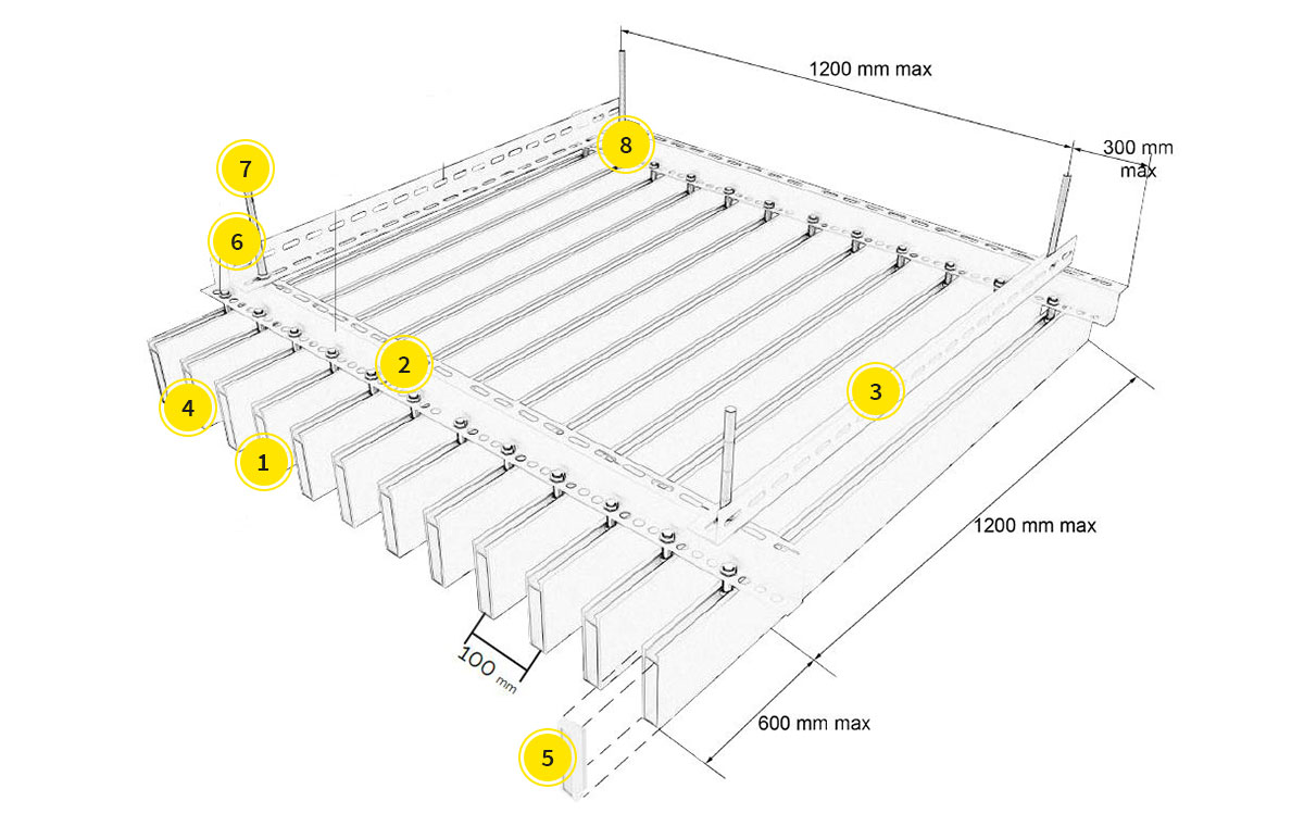 - 20mm taban enli ve 100mm yükseklikte baffle, c/c: 100mm mesafe için 6 kg/m²
