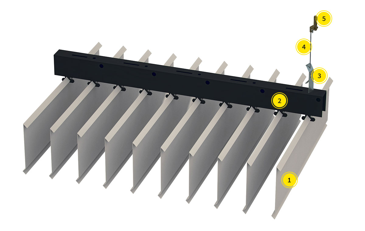 Le déflecteur et vector plafonds sont constitués de panneaux linéaires en différentes dimensions qui pendent verticalement. Ce modèle léger, monté sur flotteurs de bord est souvent l'éléments de plafond pour réduire la hauteur de plafond sans compromettre le volume de la salle. En fournissant une autre dimension à la conception linéaire et à la région, il est possible de cacher l'équipement de service dans la casserole. Les éléments du bois métal déflecteur permettent de faire des dessins de plafond qui sont plus durables et plus faciles à maintenir que le bois. Différents modèles sont possibles en changeant la largeur de la base, de la hauteur et de la distance entre les panneaux. Le déflecteur et le vecteur du type pavillon ont facilement accès à l'espace de plafond, l'installation et le démontage est facile.