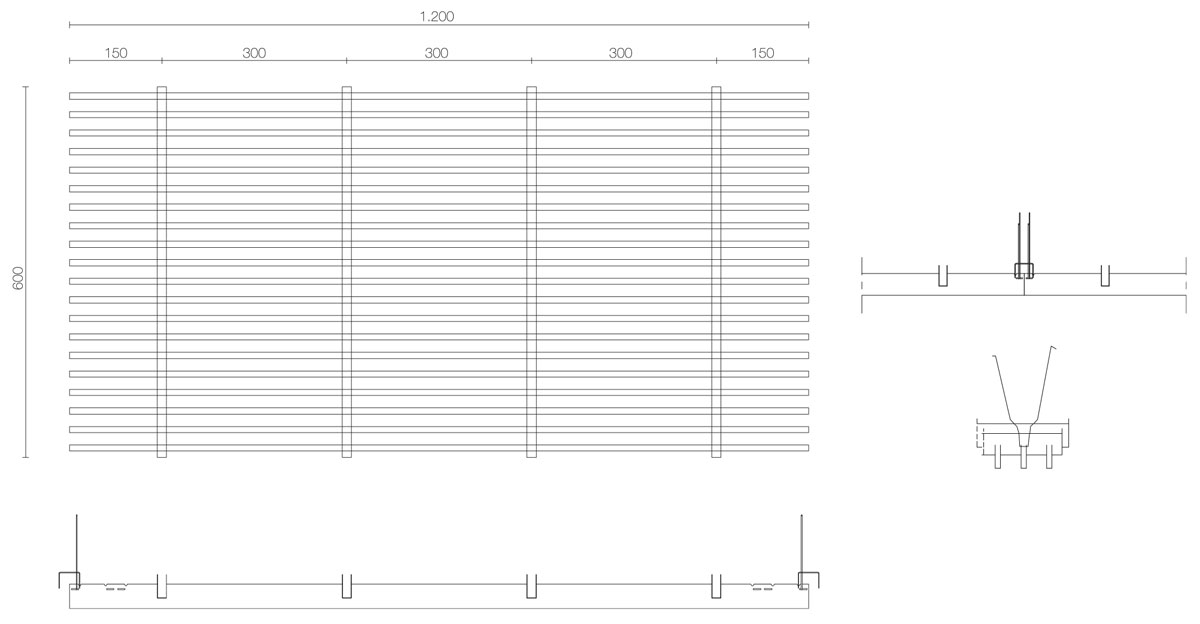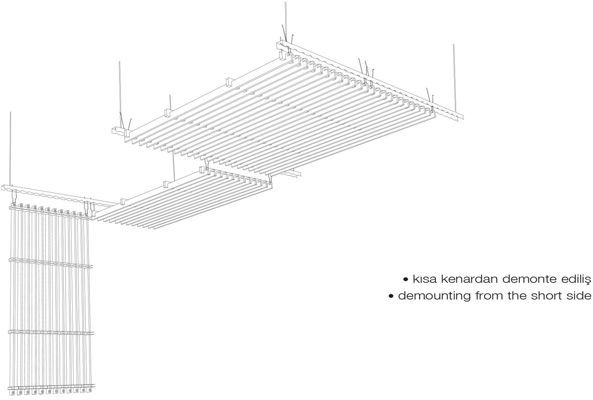 Her bir modül tek kenarından aşağıya sarkıtılır ancak tamamen demonte edilmez, klipsler vasıtasıyla aşağı doğru sallandırılarak durur. Modüller 60 cm’lik kısa kenardan demonte edilir ve boyuna doğru asılı bırakılır. İstek üzerine uzun kenardan demonte edilecek şekilde de üretim yapılabilir.