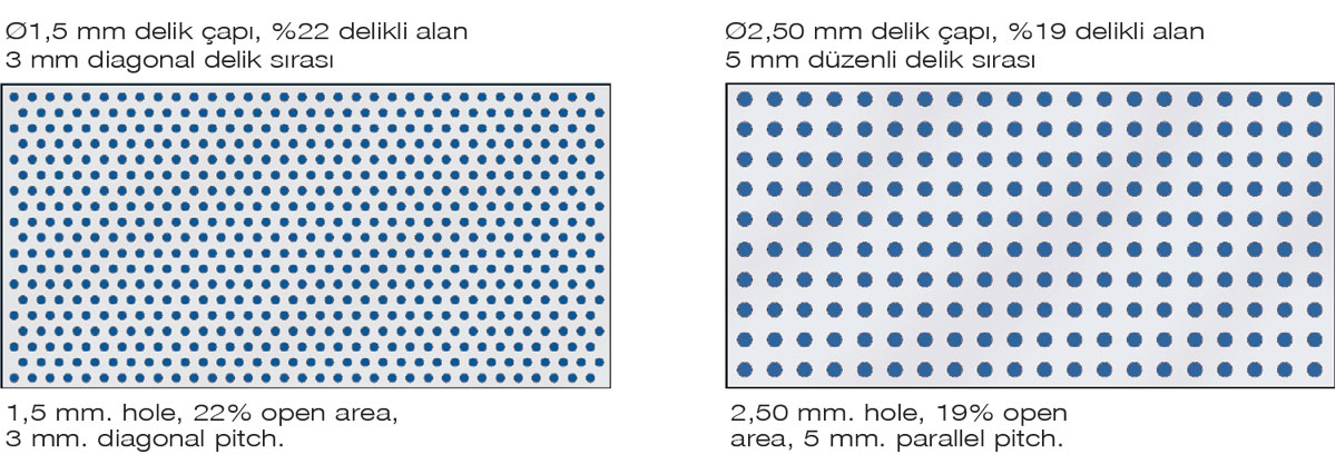 Diamètre d'alésage Ø 1,50 mm, 22 % zone perforée, 3 mm de intervalle de trou diagonale. Diamètre d'alésage Ø 2,50 mm, 19 % zone perforée, 5 mm d'espacement des trou intervalle de trou régulier. Ils peuvent être obtenus à l'aide de pré-peints ou post-peints matière première en aluminium. Il est possible de fabriquer selon les préférences à partir des couleurs de graphiques comme RAL,NCS, PANTONE et SIKKENS.