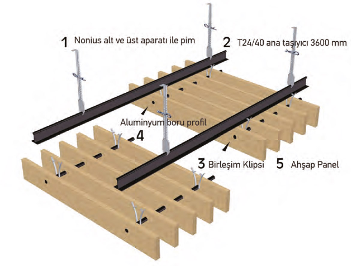 Plafond en bois linéaire système est un système extrêmement plafond décoratif qui est formé par l'organisation de la mdf lam parquet en bois massif ou de jute dans les intervalles et les jambages désiré en faire un module et l'intégrer dans le système de convoyeur et lui permet d'être démonté et monté. La simplicité de la coupe et de la manipulation des matériaux utilisés, la hauteur, et la taille peuvent être fournis comme désiré, offrant un large éventail de possibilités pour les designers. Les bois linéaires image contribue à la fois à des préoccupations esthétiques et à la circulation de l'air de l'environnement.