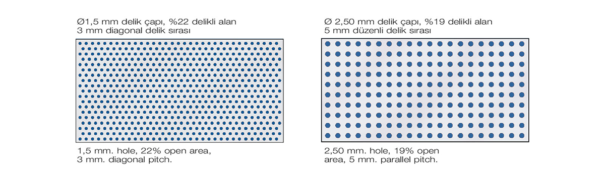 MONOBLADE может поставляться как обычным, так и перфорированным для достижения эстетических и акустических требований. Стандартные варианты перфорации:отверстие ø 1,50 мм, заполненность отверстиями 22%, шаг 3 мм. отверстие ø 2,50 мм, 19% заполненность отверстиями, шаг 5 мм.